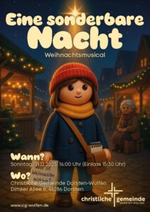 Am 21. Dezember, 16:00 Uhr laden wir ein, zum Weihnachtsmusical „Eine sonderbare Nacht“. Es findet in unseren Gemeinderäumen Dimker Alle 8 Statt.